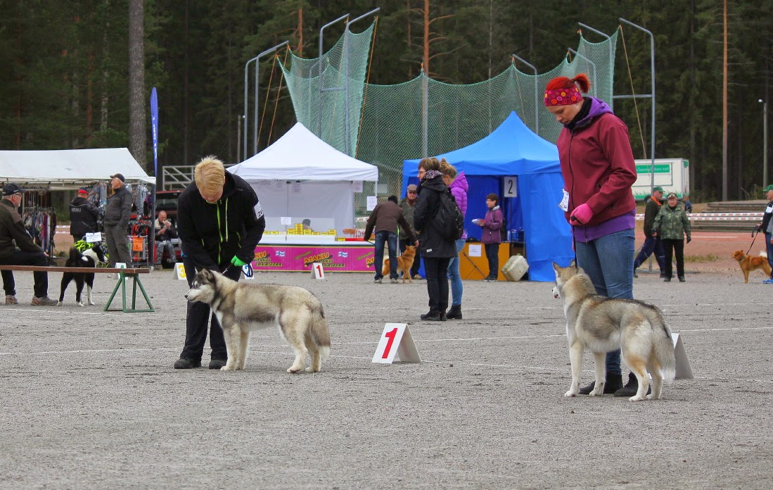 Näytelmäkäynti numero kaksi olikin viime viikon lauantaina Ruovedellä, tällä kertaa tuomarina oli meille uusi tuttavuus Esa Ruotsalainen. Odotuksia ei sinällään ollut, toiveikkaana olin sen puolesta että jos saisimme ensimmäistä kertaa elämässämme kokoon myös kasvattajakehän. Omista koiristamme näyttelyyn osallistuivat Katti, Moria, Minerva ja Malla. Lisäksi näyttelyyn osallistuivat Ämmäpentueesta Mellon ("Vaara") ja Mordor ("Morris"). Päätin etukäteen esittää Kattin lisäksi myös Minervan, sillä halusin kokeilla toimiiko se minulle paremmin kuin edellisessä näyttelyssä Mikalle. Molemmat likat esiintyivät mielettömän hienosti, olin niiiin iloinen ettei sitä voi uskoa kukaan! Moria meinasi vähän innoitella Mikan käsissä ja Malla suorastaan vähän sikaili ;) Tuloksellisesti tämä näyttely sujui suorastaan erinomaisesti, eniten mieltäni kuitenkin ehdottomasti lämmitti koirien rentous ja iloisuus! Toki sitä hiottavaa ja harjoiteltavaa on vielä ja paljon, siitä viis. Nyt oli hyvä fiilis ja omistakin kintuista löytyi sen verran vauhtia että ihan hiuksetkin nousivat pystyyn päivän edetessä ;)